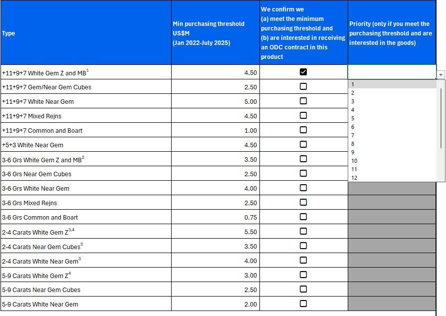 Each Group should submit a single Expression of Interest and it will cover your application for both International and Beneficiation contracts. Note that Beneficiation contracts will be available in 2-5Cts White Gem Z and 5-9Cts White Gem Z. If you meet the minimum purchasing requirement and are interested in receiving a contract in these materials, please tick the box next to these assortments. If you have also polished diamonds in Botswana in the January 2024 – July 2025 period, please indicate this by ticking the box in the ‘Acknowledgement’ section. From your responses to these questions, we will be able to determine that you are both interested in Beneficiation materials and that you have been polishing locally recently. On the same form you can express your interest in materials which will be made available for International contracts.